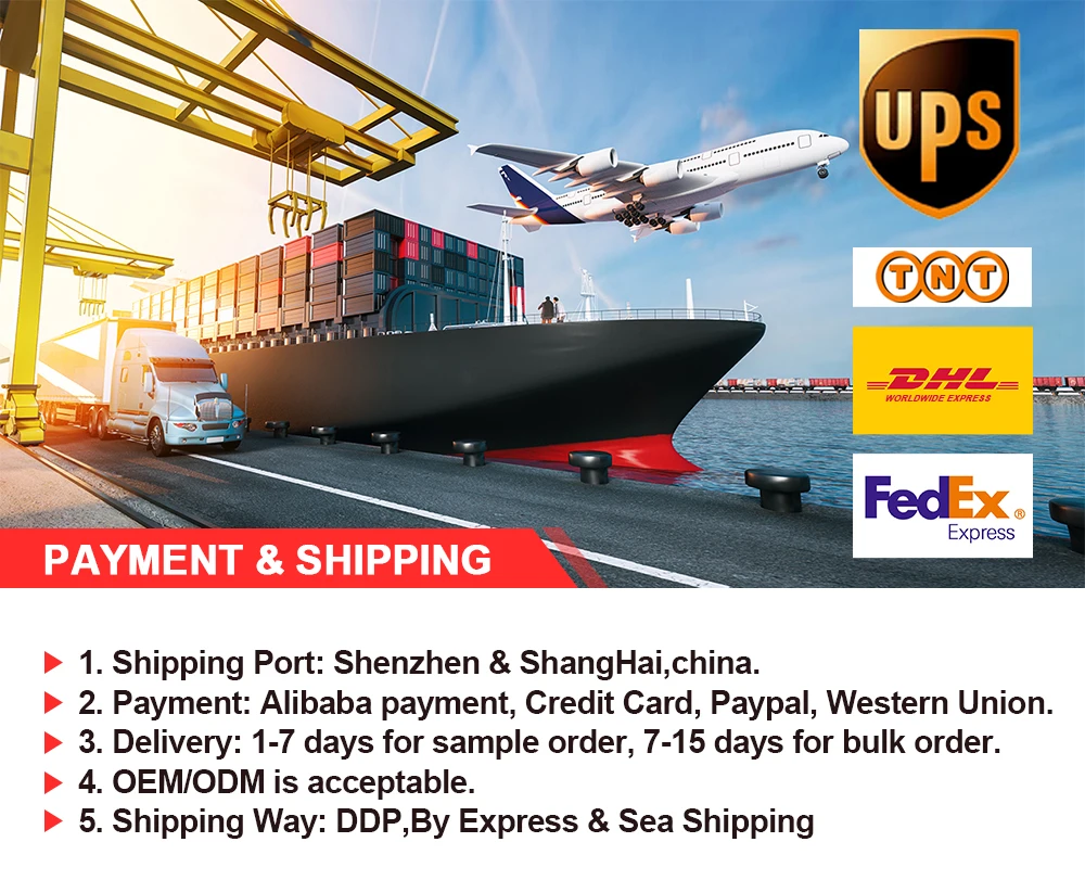 A: Samples need 3-5working days, for quantity order, need about 15-20 working days (depend on detailed quantity of the order). We use Express (DHL, UPS, FedEx Or TNT).It usually takes 3-7 days to arrive except Sea transportation.
